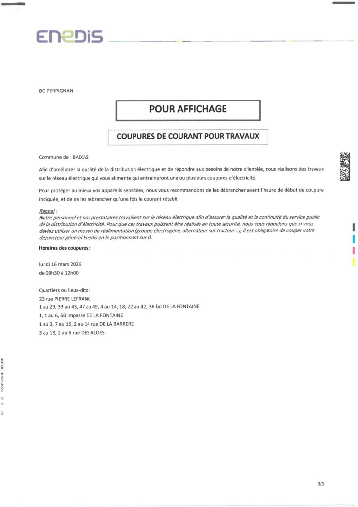 Coupure de courant pour travaux – Lundi 16 mars 2026 entre 8h30 et 12h